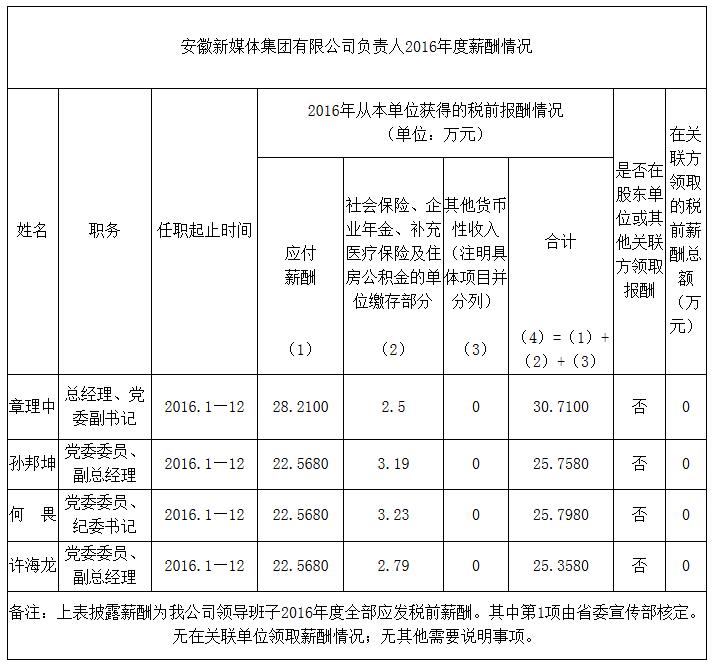 安徽新媒體集團(tuán)有限公司負(fù)責(zé)人2016年度薪酬情況