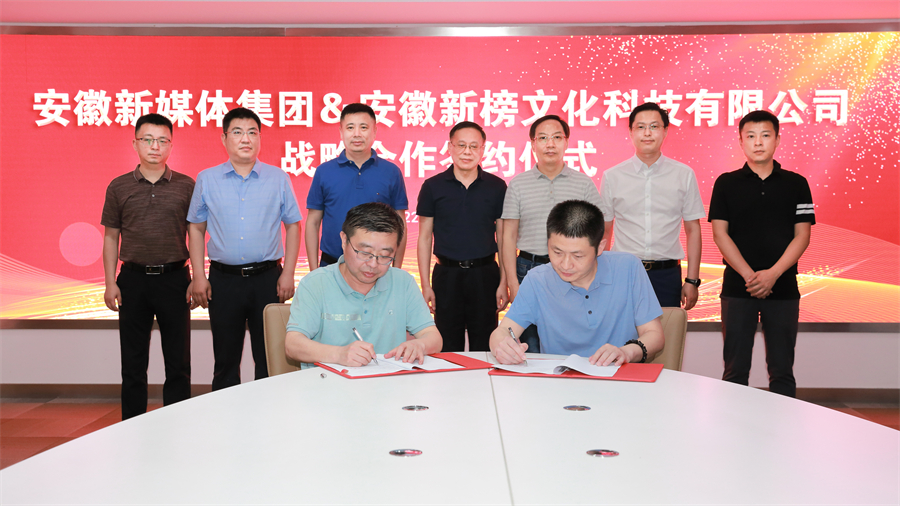 當天,雙方在安徽新媒體集團融媒體中心舉行了戰(zhàn)略合作簽約儀式,安徽新媒體集團代表宋光和安徽新榜文化科技有限公司代表楊宇進行簽約。